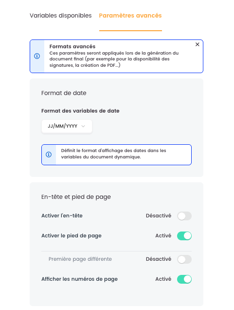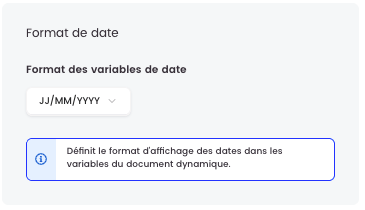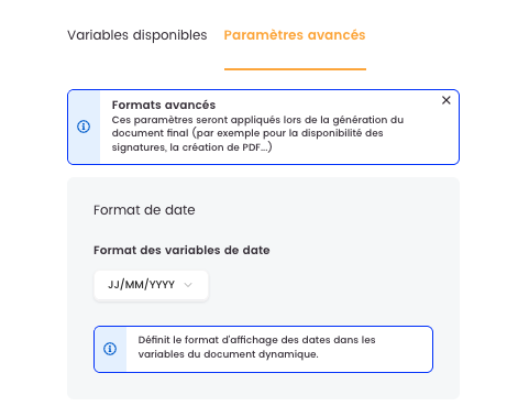 Il est désormais possible de définir explicitement le format de date utilisé dans les variables d’un document dynamique. Ce réglage, disponible dans les paramètres avancés du document, sécurise l’affichage des dates dans les documents contractuels, quelle que soit la langue de la plateforme.